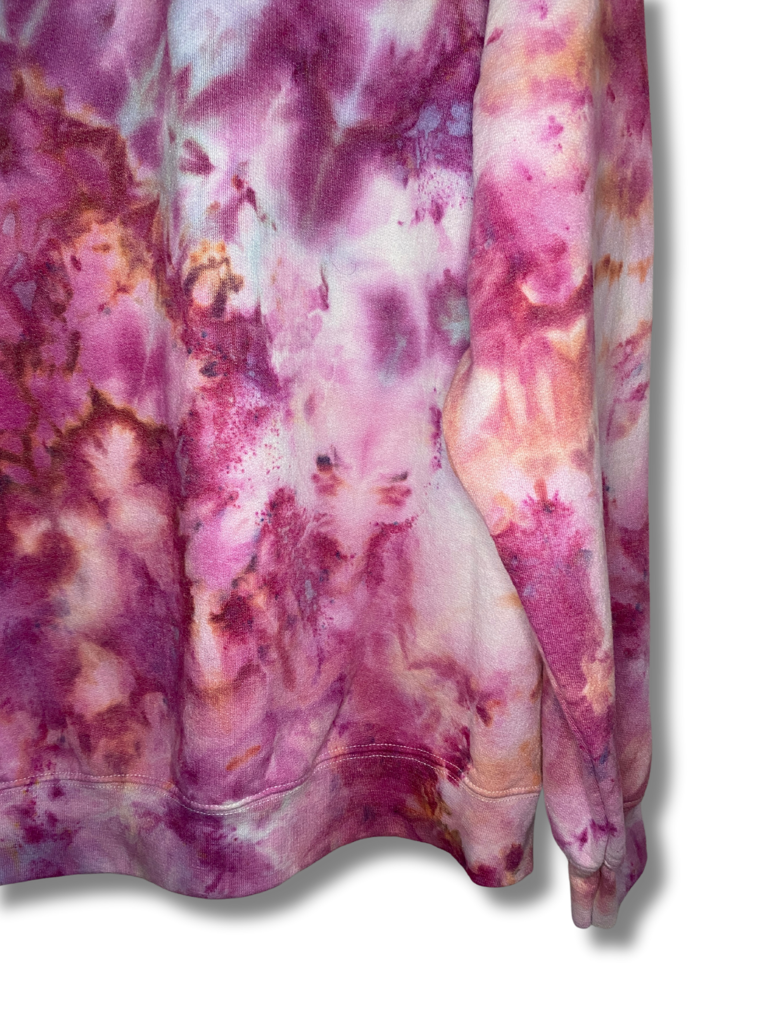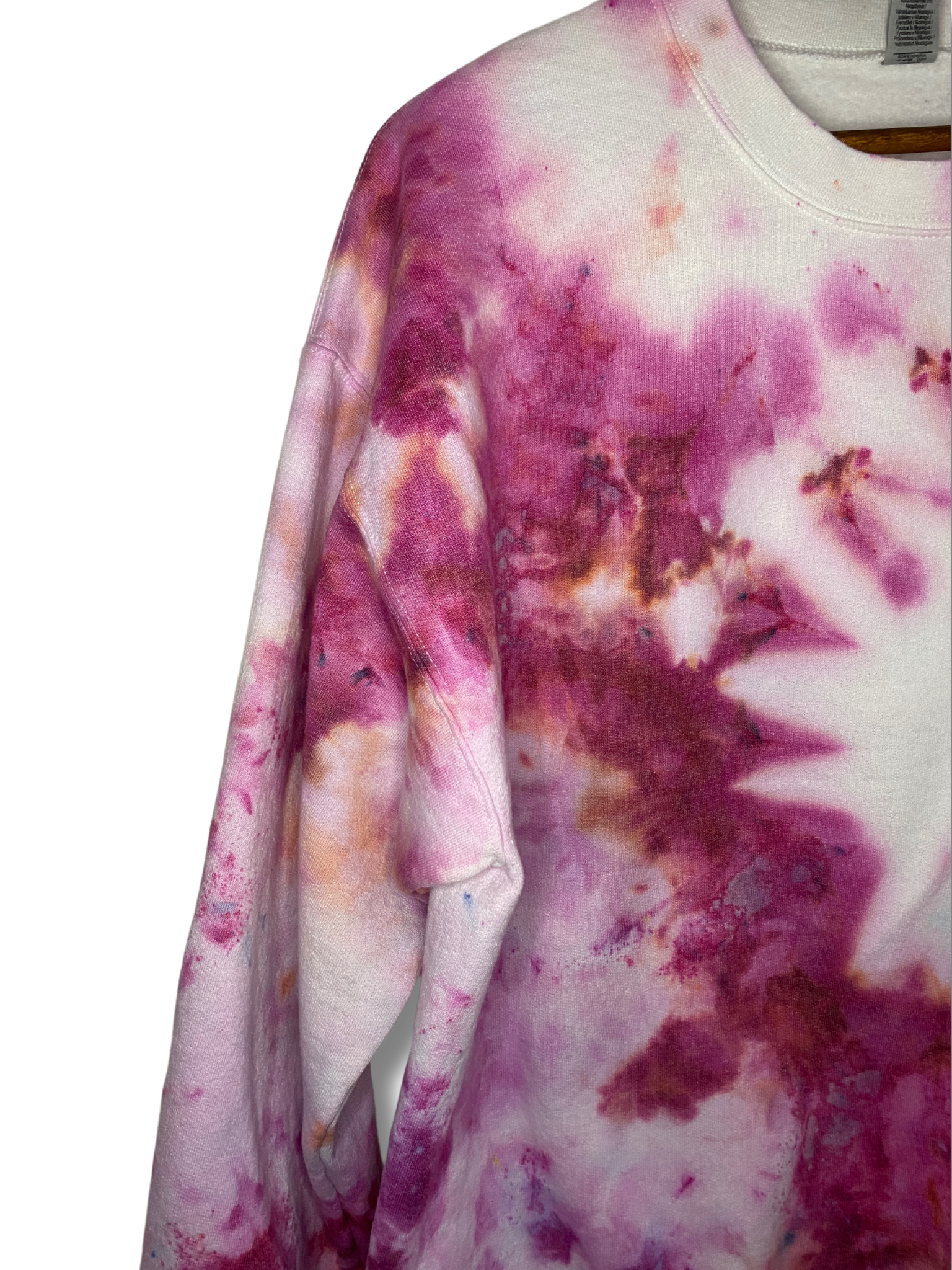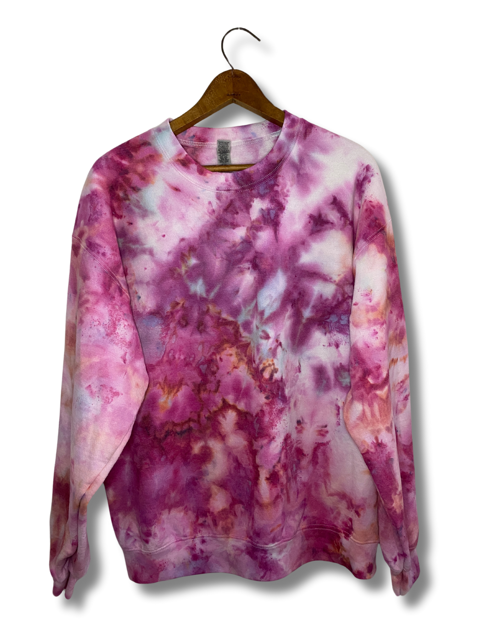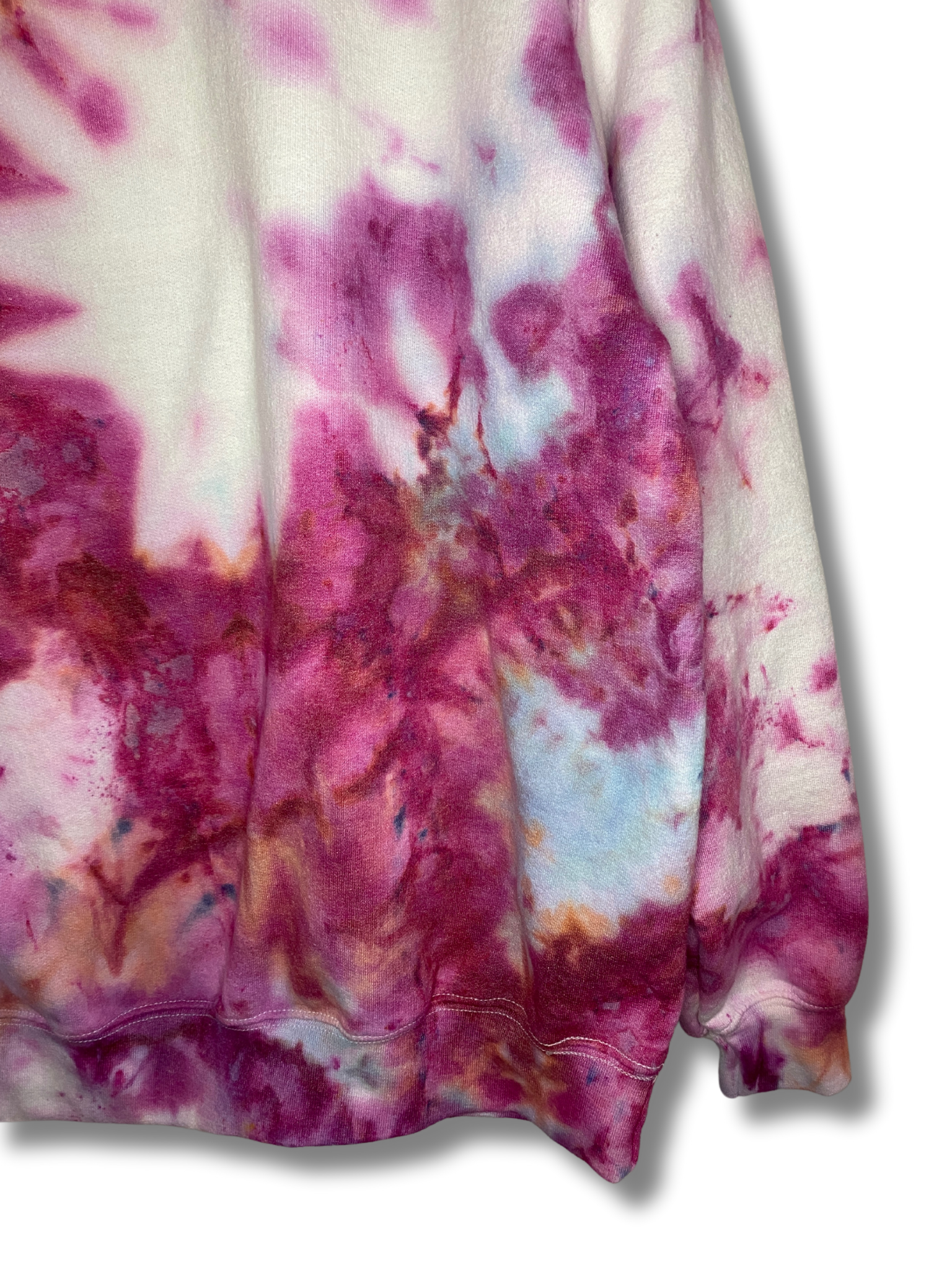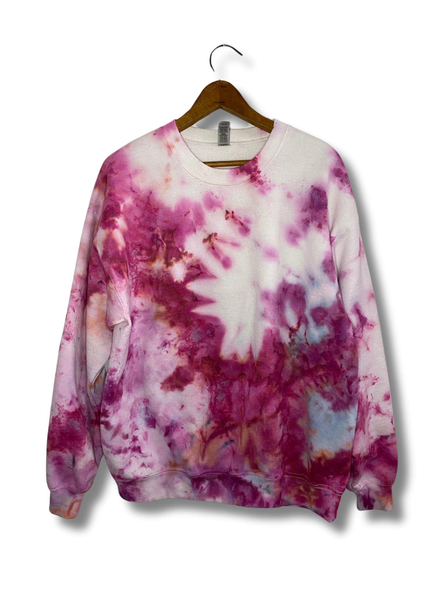 The Cherry Lips, Crystal Skies Ice Dye Crew is a gorgeous mix of berry hues with pops of sky blue and peach.