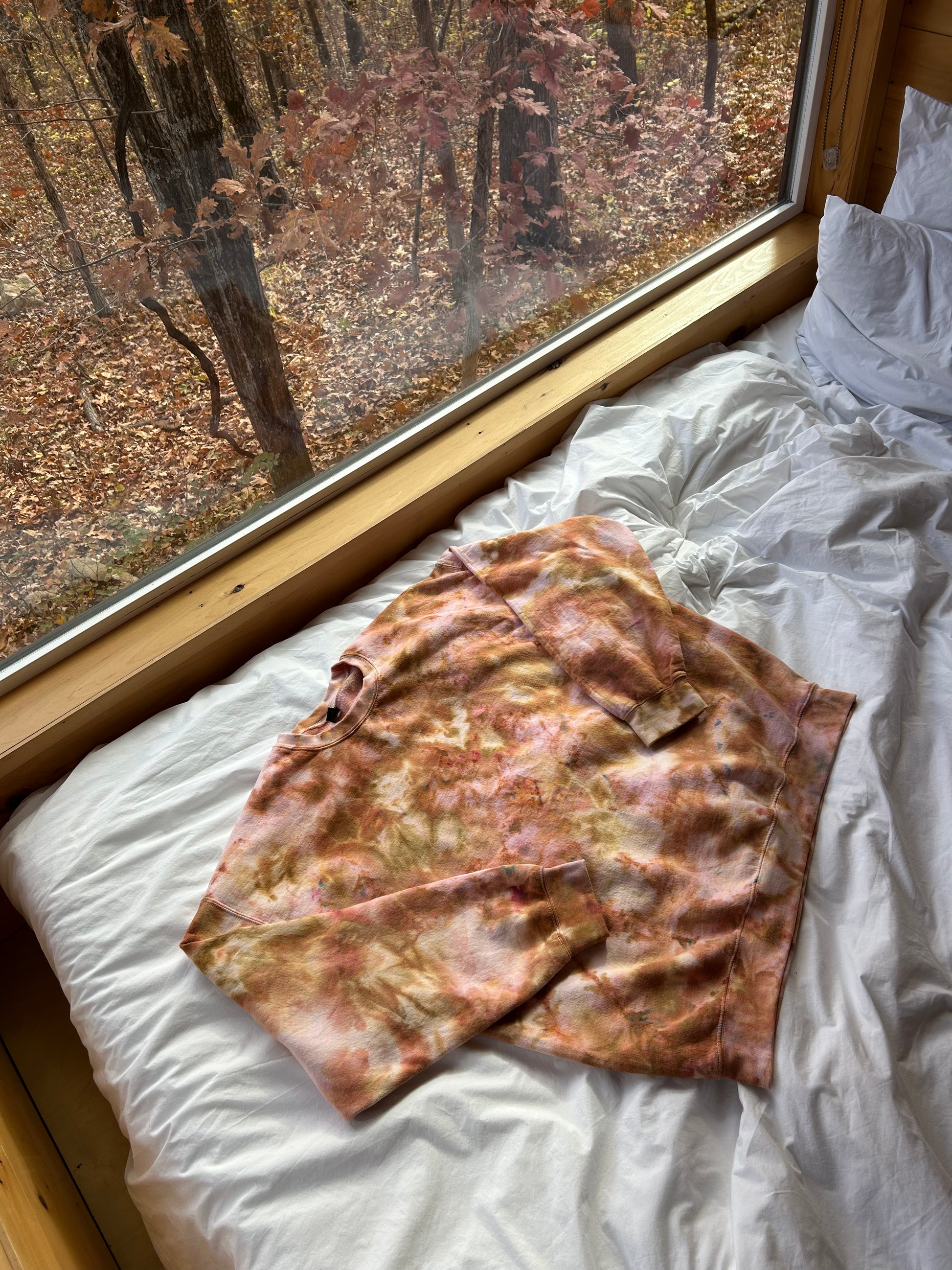 The Golden Hour Ice Dye Crew is a a one-of-a-kind, hand-dyed sweatshirt that captures the colors of late-autumn light, warm amber, rose clay, and soft sienna blending like sun through the trees.