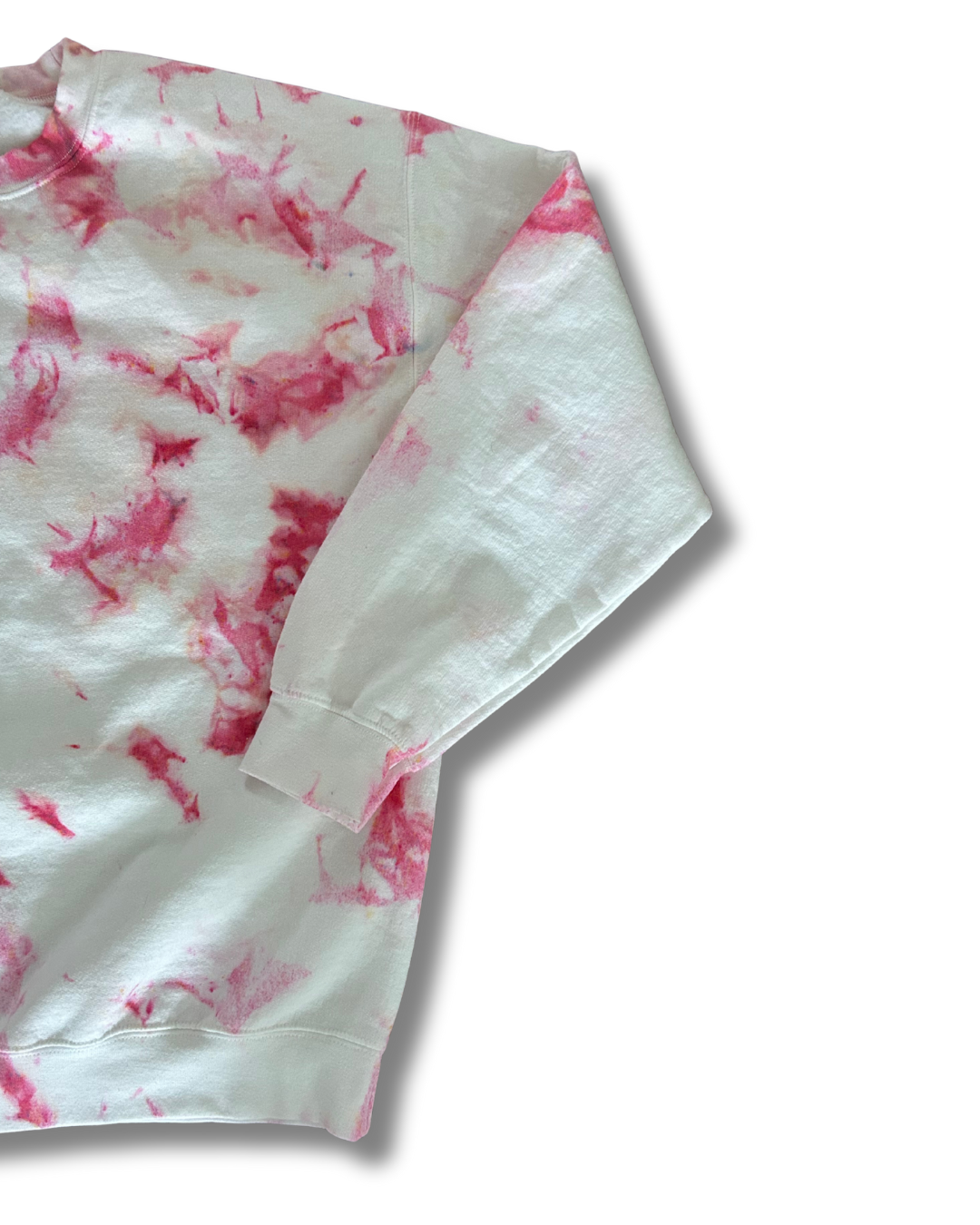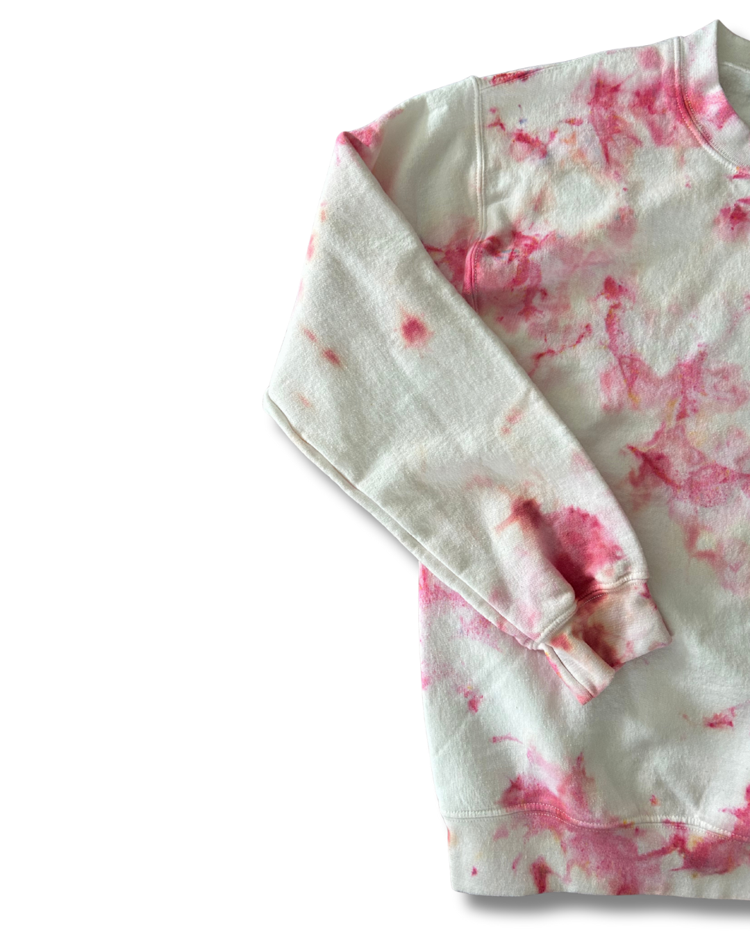 The Love Letter Ice Dye Crew is a one-of-a-kind, hand-dyed sweatshirt in soft pink and white tones, subtle, romantic, and easy to wear long after Valentine’s Day.