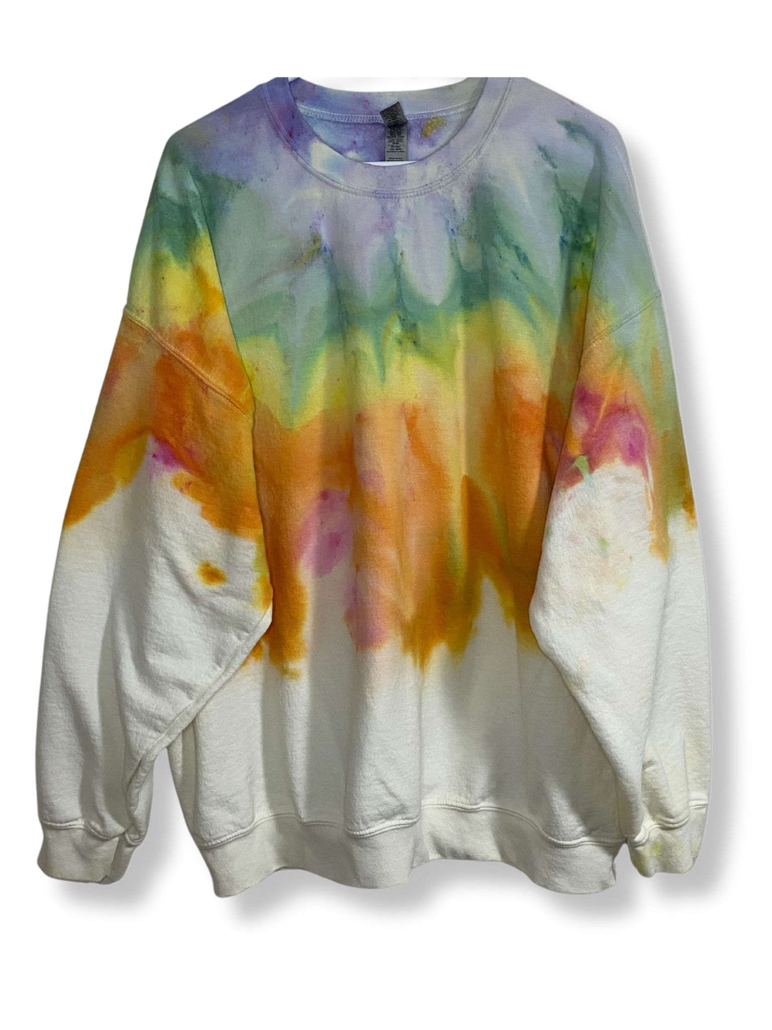 This is a small batch event and can never be perfectly replicated. These crews were all ice dyed together using the same colors but each turned out a little differently and beautifully unique.